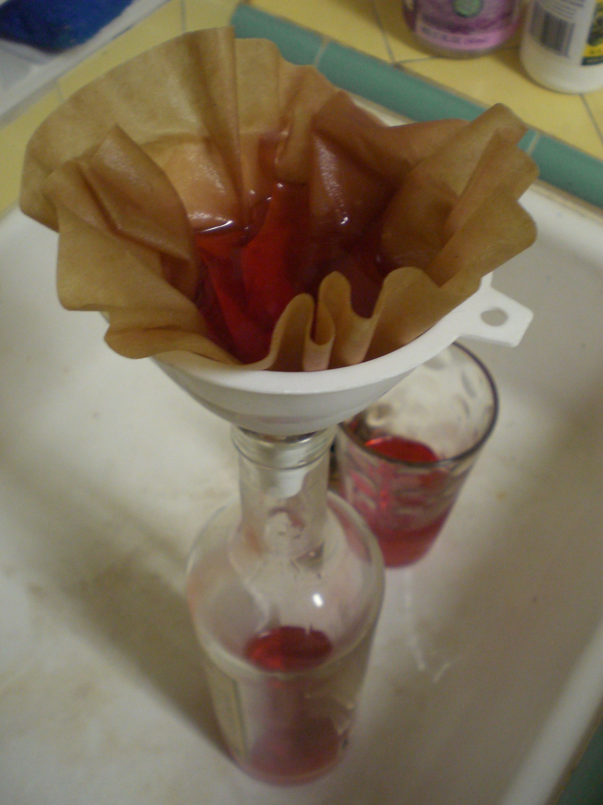 Filter through a strainer and cheesecloth into one receptacle. Then filter through a double layer of coffee filters into the final bottle. I tend to wet down the filters first.